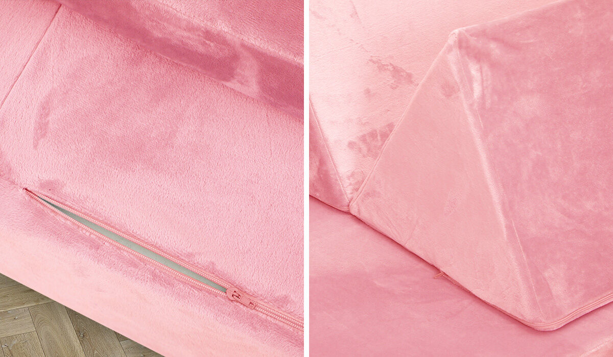 The couch comes in multiple foam pieces (base, toppers, triangles) that can be stacked, built, or laid out – no zips or clips needed.